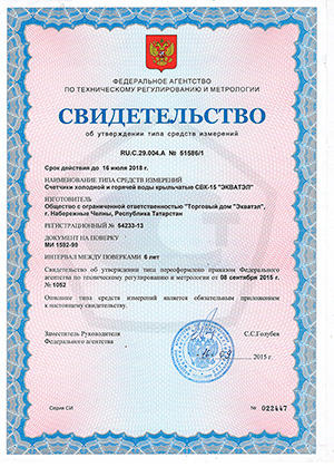 Счетчик учета воды СВК-15 «Экватэл» прошел испытания, имеет все сертификаты, соответствует всем нормативным требованиям ГОСТ, ТУ и внесен в Государственный реестр.